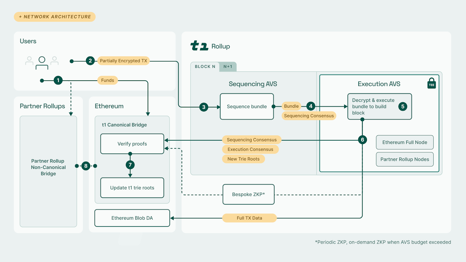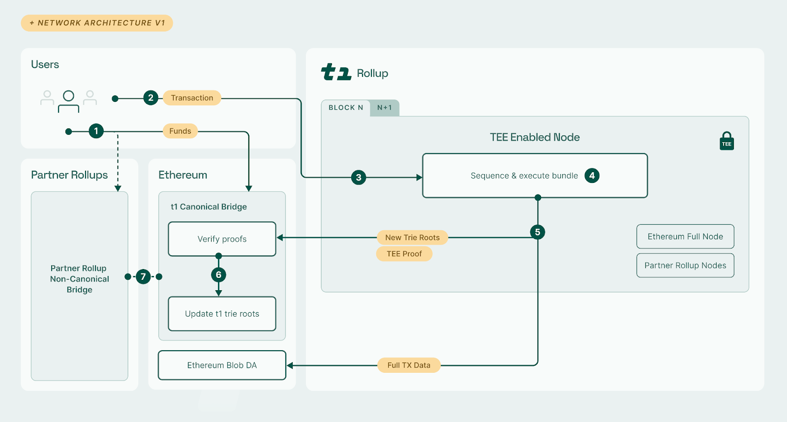 4. The TEE-enabled sequencer generates new trie roots r and a TEE proof. These are submitted to the t1 Canonical Bridge contract on Ethereum and the full compressed transaction data is submitted to Ethereum blob DA.